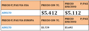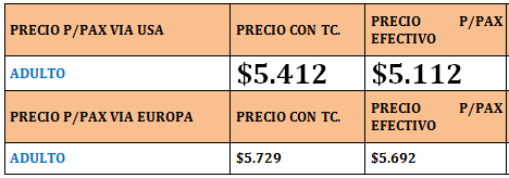 • PARA RESERVACION EN FIRME SE REQUIERE UN DEPÓSITO DE USD 400 (NO REEMBOLSABLE, NI CANJEABLE, NI ENDOSABLE).